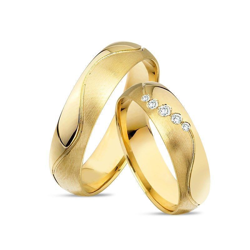 Ein Paar elegante Trauringe/Verlobungsringe, die klassisches Design mit moderner Finesse kombinieren. Der Damenring ist mit fünf Brillanten verziert, die zusammen 0,09 ct ergeben, während der Herrenring schlicht und raffiniert ohne Brillanten ist.