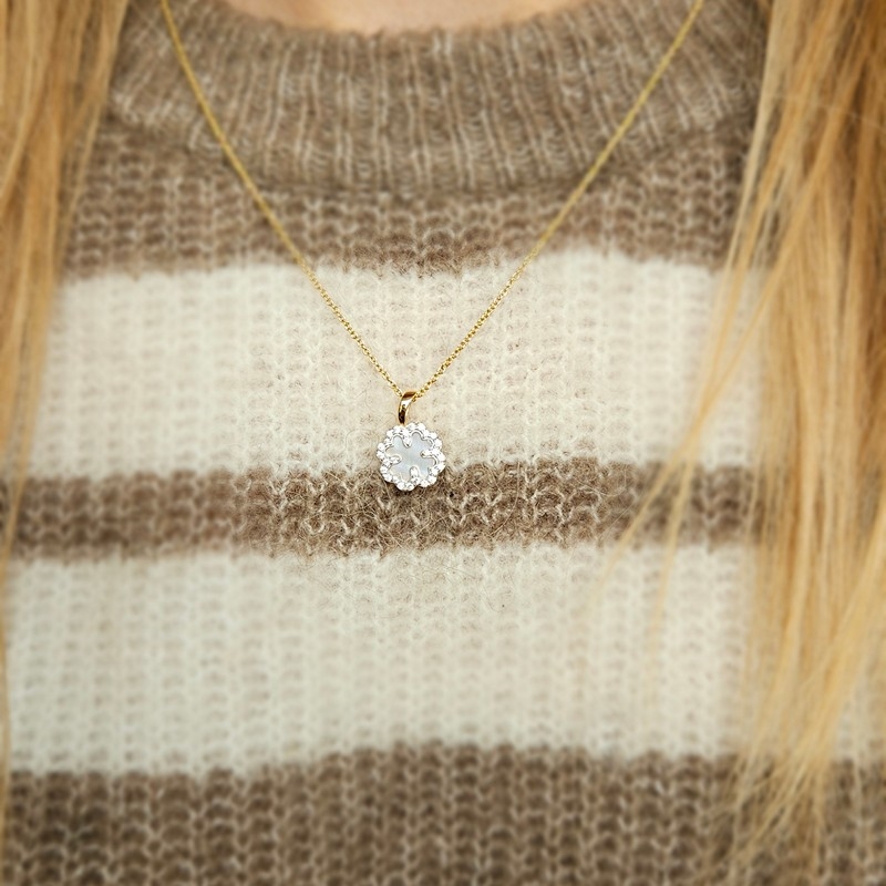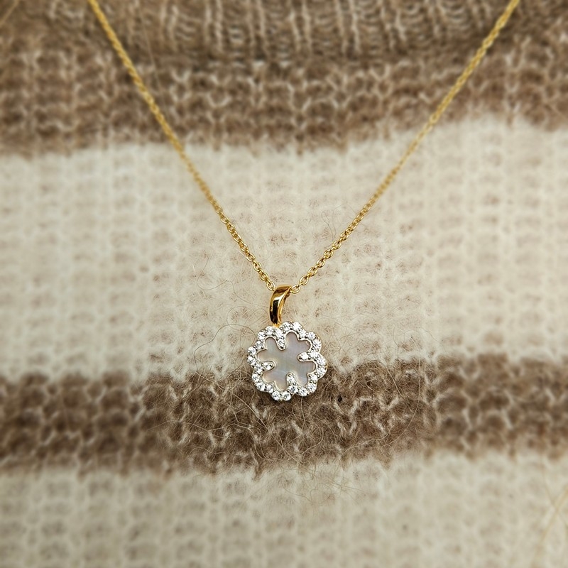 8kt Gold Kleeblatt-Anhänger mit zirkonia, Perlmutt und vergoldeter Kette8kt Gold Kleeblatt-Anhänger mit zirkonia, Perlmutt und vergoldeter Kette