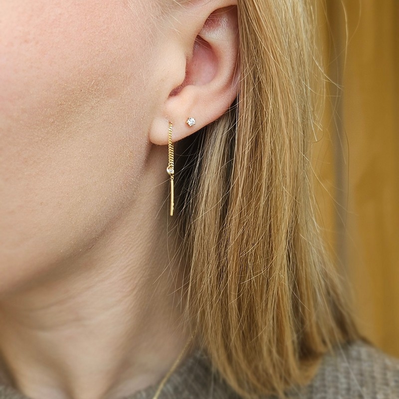 Diese schönen Kettenohrringe aus 8 kt Gold vereinen modernes Design mit klassischer Eleganz. Die Ohrringe sind als feine Kette gestaltet, die durch das Ohr gezogen wird, was einen leichten und luftigen Effekt verleiht. Am Ende der Kette sitzt ein klarer zirkonia, der das Licht einfängt und deinem Look einen dezenten, aber auffälligen Glanz verleiht. Die Kombination aus dem warmen Rotgold und dem klaren Stein bietet einen schönen Kontrast, der die Ohrringe sowohl zeitlos als auch modern macht.