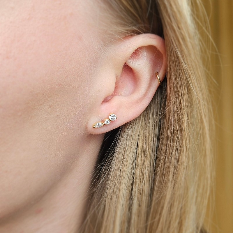 Hier erhalten Sie ein Paar einzigartige und moderne Ohrstecker aus 8 Karat Gold, gestaltet mit drei klaren zirkonia auf jedem Stecker in verschiedenen Formen. Die Steine sind in einer leicht länglichen und etwas kantigen Komposition angeordnet, die den Ohrringen einen spannenden und charaktervollen Ausdruck verleiht. Die Kombination der verschiedenen Schliffe sorgt dafür, dass die Steine das Licht auf unterschiedliche Weise einfangen, was bei jeder Bewegung einen schönen und lebhaften Glanz erzeugt. Das Ergebnis ist ein Schmuckstück mit einem modernen Twist, das dennoch einen eleganten und femininen Ausdruck bewahrt.
