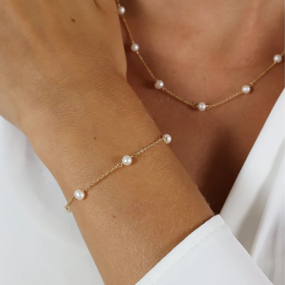 Armband in 8kt. Gold von Aagaard mit mehreren kleinen Süßwasserperlen, die ca. 4 mm messen. Das feine Armband ist um eine Kette aufgebaut, auf der in Abständen mehrere Perlen sitzen.