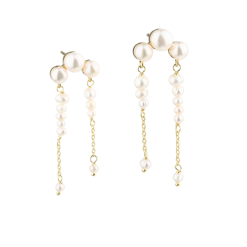 Die klassischen Süßwasserperlen werden hier auf eine neue und spannende Art verwendet. Der Ohrring beginnt als feiner Ohrstecker am Ohrläppchen, von dem zwei Ketten elegant nach unten fallen. An den Ketten sitzen mehrere kleinere Perlen, die eine schöne Bewegung erzeugen, wenn du die Ohrringe trägst. Das sorgt für einen leichten und femininen Look, bei dem die feinen Details wirklich zur Geltung kommen.