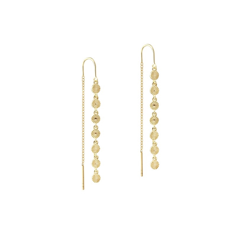 Line Ohrhänger von Aqua Dulce haben einen klaren und eleganten Ausdruck, bei dem die Wiederholung der kleinen, münzähnlichen Elemente ein schönes und harmonisches Design schafft. Die feinen Coins sind mit einer sonnenstrahlartigen Struktur verziert, die den Ohrringen ein lebendiges Spiel und einen sanften Glanz verleiht, wenn sie vom Licht getroffen werden.