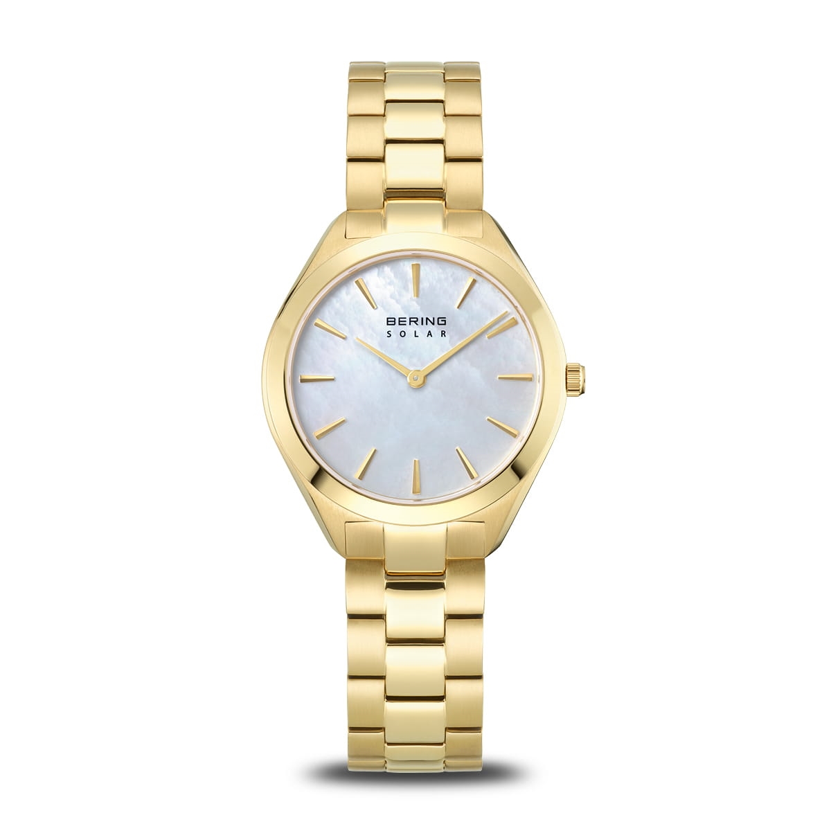 BERING Damenuhr in goldfarbenem Stahl mit Perlmuttzifferblatt aus der Solar-Kollektion.