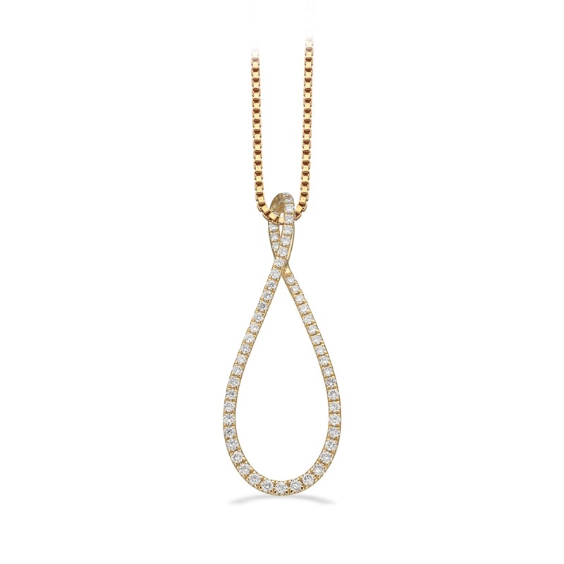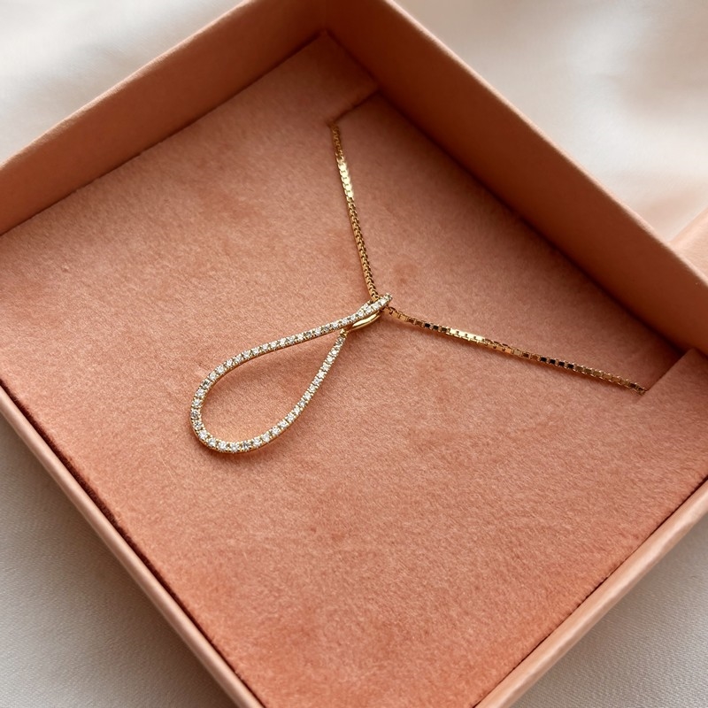 Diese wunderschöne Dazzling Halskette aus 14 Karat Gold ist eine elegante Wahl für alle, die ein klassisches Schmuckstück mit einem dezenten Hauch von Luxus wünschen. Der Anhänger ist als elegante, gedrehte Tropfenform gestaltet, die oben mit einer weichen und leicht gebogenen Linie beginnt, sich leicht dreht und in eine längliche Tropfenform übergeht, die in der Mitte offen ist. Die Form verleiht einen raffinierten Ausdruck, der an eine leicht gedrehte Schleife oder ein dezentes Infinity-Twist erinnert.
