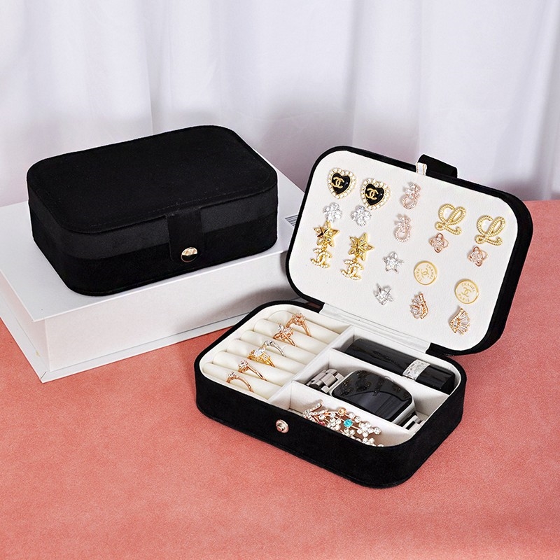 Die schwarze Farbe sorgt für einen klassischen und ruhigen Look, der zu jedem Stil passt. Die längliche, rechteckige Form macht das Schmuckkästchen besonders funktional, da es viel Platz für verschiedene Schmuckarten bietet, ohne unnötig in der Tasche oder im Koffer Platz zu beanspruchen.