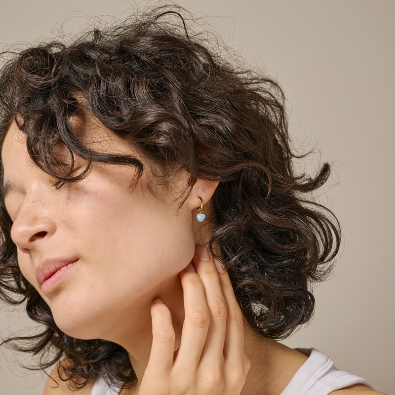 Die hellblaue Emaille schafft einen schönen Kontrast zur warmen, goldenen Oberfläche und verleiht den Ohrringen einen leichten und verspielten Look, der dennoch stilvoll und zeitlos wirkt. Die Amore Hoops messen 20 x 7 mm und sind als Klappcreolen gestaltet, was sie im Alltag einfach an- und abzulegen macht. Sie sind leicht und angenehm zu tragen und sitzen sicher am Ohr.