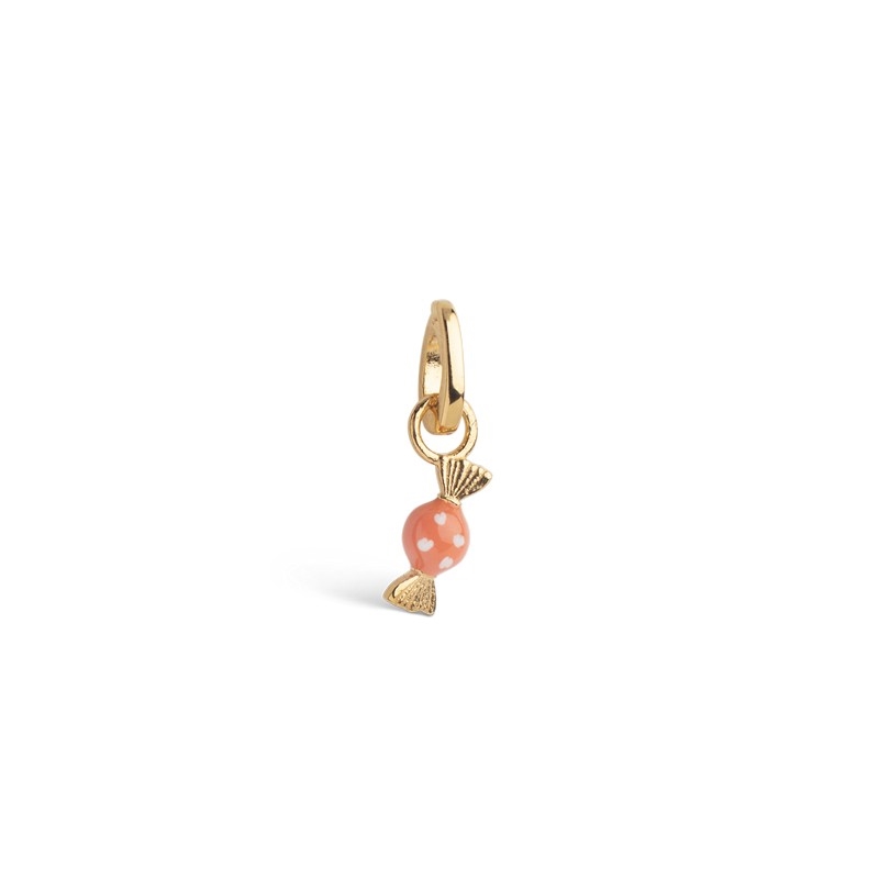 Cute Candy Charm in vergoldetem Silber von Enamel Copenhagen ist ein niedlicher kleiner Anhänger, geformt wie ein Stück Bonbon, eingewickelt in rosa Papier. Die korallenfarbene Emaille mit feinen weißen Punkten verleiht dem Charm einen zuckersüßen und humorvollen Ausdruck, der wunderschön mit dem warmen Glanz des Goldes harmoniert. Die Farben erinnern an Sommer, Sonne und fröhliche Momente voller lustiger Erinnerungen.