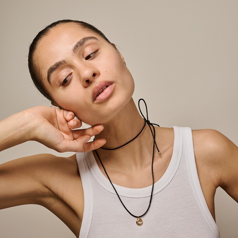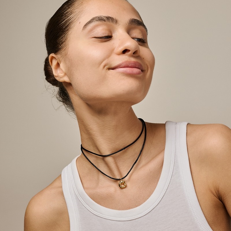 Sora Tie Halskette von Enamel Copenhagen ist ein elegantes und modernes Schmuckstück, ausgeführt in vergoldetem Silber mit einem leichten und verspielten Ausdruck. Die Halskette besteht aus einer feinen Nylonschnur mit einem kleinen Anhänger in der Mitte, geformt in weichen, organischen Linien, die einen natürlichen und femininen Ausdruck verleihen. Das einfache Design macht es leicht zu stylen, und Sie können die Halskette auf verschiedene Arten binden – als kurzes, choker-inspiriertes Aussehen oder länger für einen entspannteren Ausdruck.
