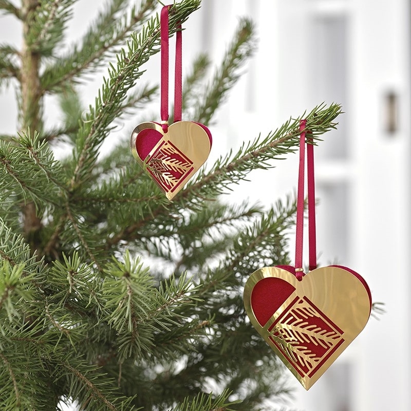 Weihnachtsherz mit einem stilisierten Tannenzweig. Das süße Weihnachtsherz ist mit rotem, abnehmbarem Filz gefüttert und wird mit einem roten Band geliefert, damit es am Baum aufgehängt werden kann. Das Weihnachtsherz ist aus 18 kt. vergoldetem Messing gefertigt und hat eine schöne glänzende Oberfläche.