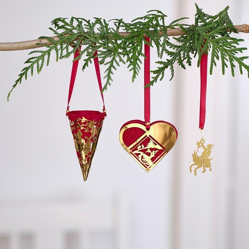 Weihnachtsherz und Kegel sind mit rotem, abnehmbarem Filz ausgekleidet, und die mitgelieferten roten Bänder erleichtern das Aufhängen der Anhänger am Weihnachtsbaum. Die anderen Anhänger sind wunderschön detailliert und passen perfekt zusammen in Stil und Ausdruck. Zusammen schaffen sie eine gemütliche und klassische Weihnachtsstimmung – ideal als Geschenk oder für Ihre eigene Sammlung von dänisch gestaltetem Weihnachtsschmuck.