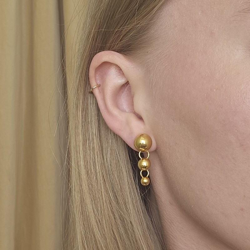 Der Atomic Drop Stud in vergoldete silber von Jane Kønig hat eine Länge von 2,5 cm und besteht aus 3 Kugeln, die immer kleiner werden, je weiter sie vom Ohrläppchen entfernt sind. Die Ohrringe lassen sich wunderbar mit dem großen Big Atomic Drop Stud kombinieren, um einen exklusiven Look zu erzielen.