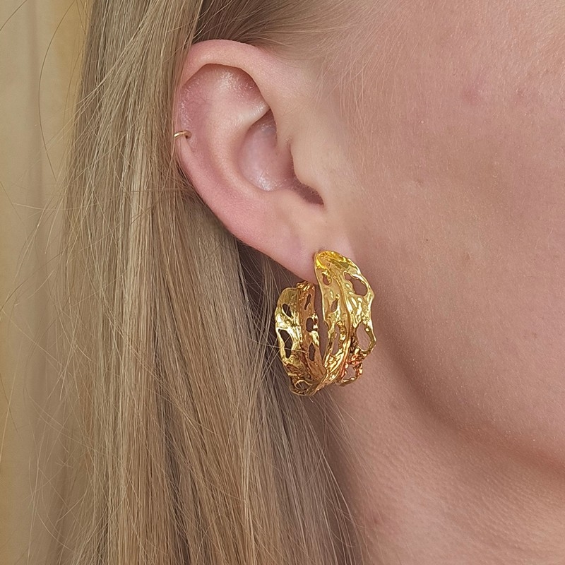 Der Big Leaf Hoop in vergoldete silber von Jane Kønig misst 3 cm im Durchmesser. Die großen Ohrringe sind wie eine Rosenblüte geformt und haben die schönste skulpturale Oberfläche. Der Ohrring ist ein klassischer offener Reif mit den schönsten Details und Nuancen.
