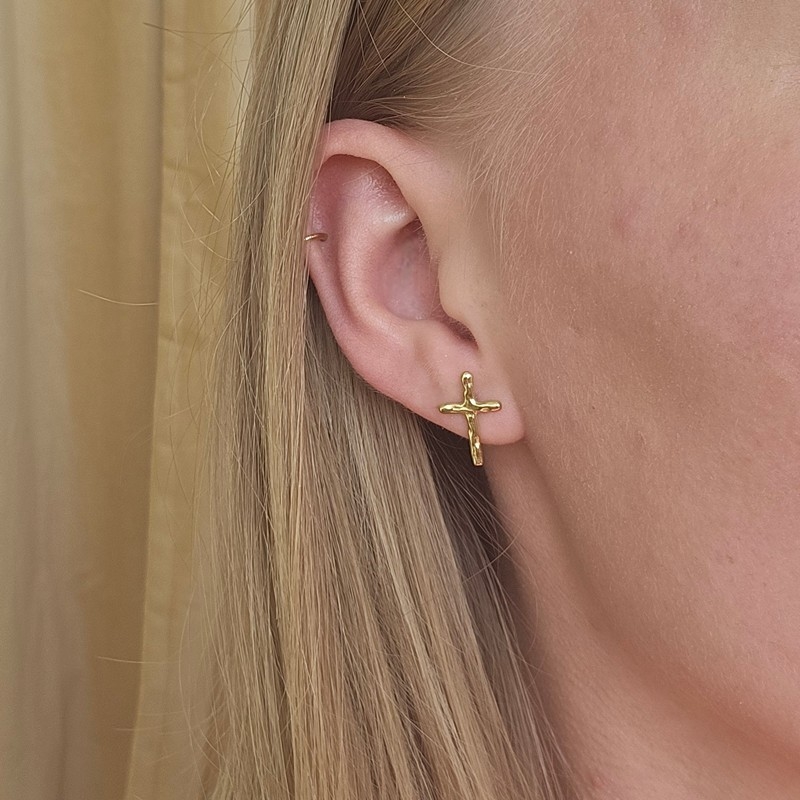 Marien-Ohrring in vergoldete silber von Jane Kønig mit kleinem Kreuz. Der Ohrring hat ein 15 mm hohes Kreuz mit einer Oberfläche aus glänzendem Gold mit einer leicht "organischen" Oberfläche.