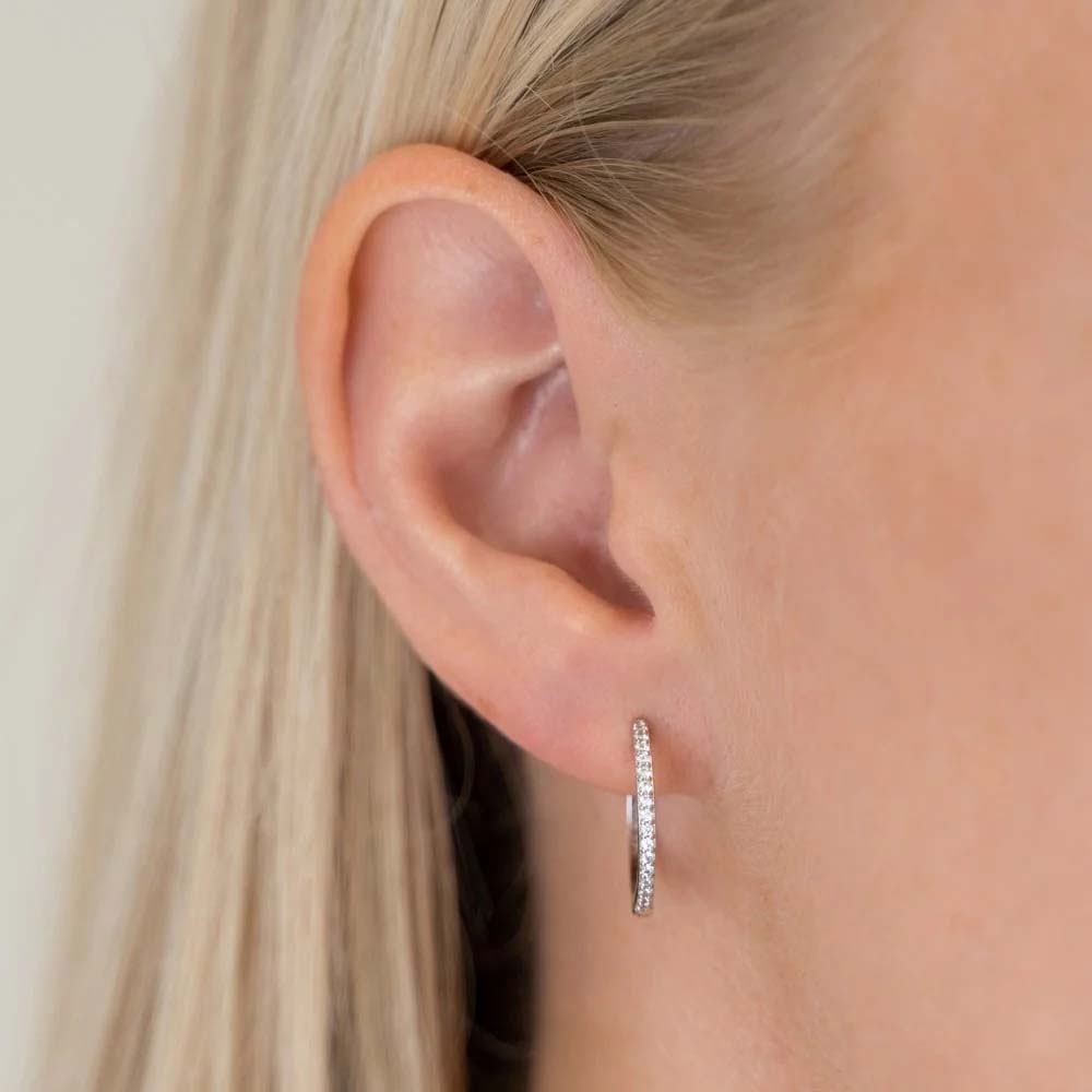 Feine Silberohrringe mit kubischen zirkonia von Joanli Nor. Die eleganten JUNENOR Creolen sind aus Sterlingsilber und messen Ø18 mm. Die Ohrringe können allein oder mit einem anderen Paar Ohrringe gestylt werden und eignen sich sowohl für den Alltag als auch für festlichere Anlässe.