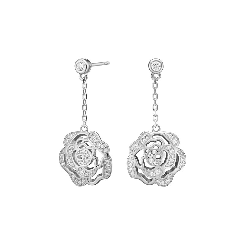 Das detaillierte Rosendesign ist in Schichten aufgebaut, wobei die offenen Linien Leichtigkeit und Tiefe in die Form bringen. Die klaren kubischen zirkonia sind an ausgewählten Stellen der Rose platziert und heben die Konturen hervor, sodass das Muster deutlich hervortritt, ohne schwer zu wirken. Das Ergebnis ist ein Schmuckstück mit Charakter, das dennoch leicht und elegant am Ohr wirkt.