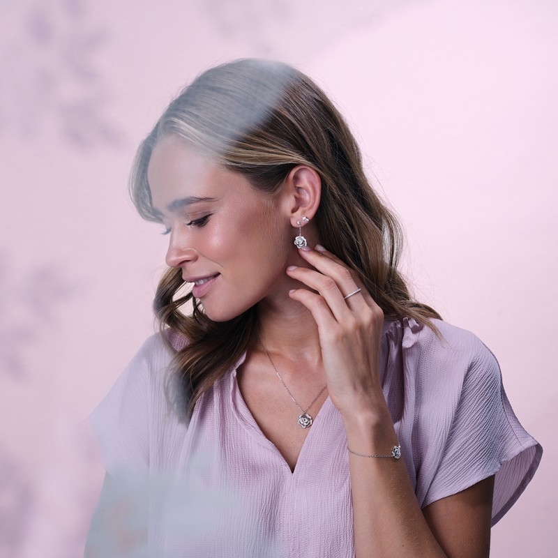 Die feine Kette verleiht den Ohrringen Bewegung und Leben, sodass die Rose natürlich fällt und ein sanftes Spiel erzeugt, wenn Sie sich bewegen. Dadurch sind sie sowohl für den Alltag geeignet, wo sie das gewisse Extra bieten, als auch für elegantere Anlässe, bei denen die Details wirklich zur Geltung kommen.