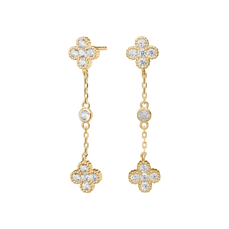 Das Design ist mit einem kleeblattähnlichen Motiv oben und unten aufgebaut, verbunden durch eine schlanke Kette, die den Ohrringen einen leichten und fließenden Ausdruck verleiht. Die klaren kubischen zirkonia fügen einen dezenten Glanz hinzu, der das Licht schön einfängt, ohne aufdringlich zu wirken. Der kleine eingefasste Stein in der Mitte der Kette schafft eine feine Balance und verbindet das Design elegant.