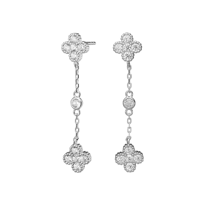 Das Design besteht aus einem kleinen kleeblattförmigen Motiv oben, das wunderschön mit klaren kubischen zirkonia besetzt ist. Von hier fällt eine feine Kette, die den Ohrringen einen leichten und lebendigen Ausdruck verleiht. In der Mitte der Kette sitzt ein einzelner Stein, und unten wird das Kleeblattmotiv wiederholt, sodass das Design natürlich und ausgewogen hängt.