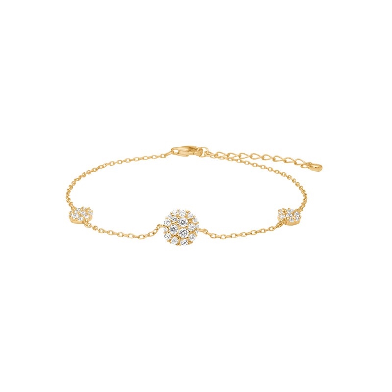 Der Blickfang des Armbands sind die runden Details, wobei das mittlere Element etwas größer ist und von zwei kleineren flankiert wird. Die runden Formen sind wunderschön mit klaren zirkonia besetzt, die dicht aneinander liegen und einen lebendigen und harmonischen Glanz erzeugen. Die Kombination aus den funkelnden Steinen und der warmen Vergoldung verleiht dem Armband einen klassischen, aber gleichzeitig modernen Ausdruck.