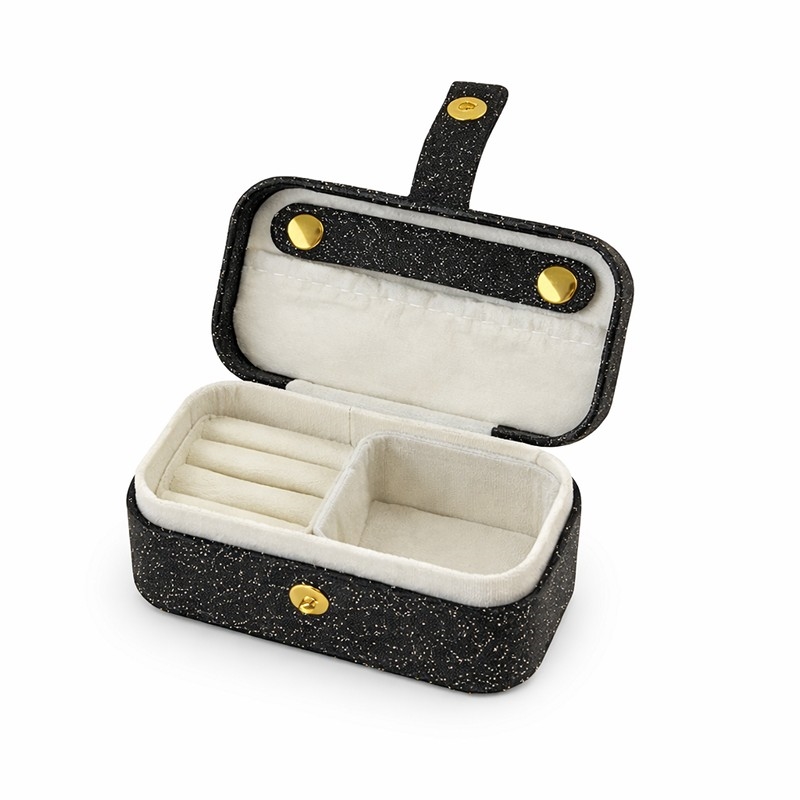 Die schwarze Außenseite hat einen dezenten Glitzerschimmer, der dem Schmuckkästchen eine schöne Optik verleiht, ohne zu auffällig zu wirken. Dadurch eignet es sich sowohl für den Alltag als auch für Reisen, wenn du eine hübsche und funktionale Aufbewahrung möchtest.