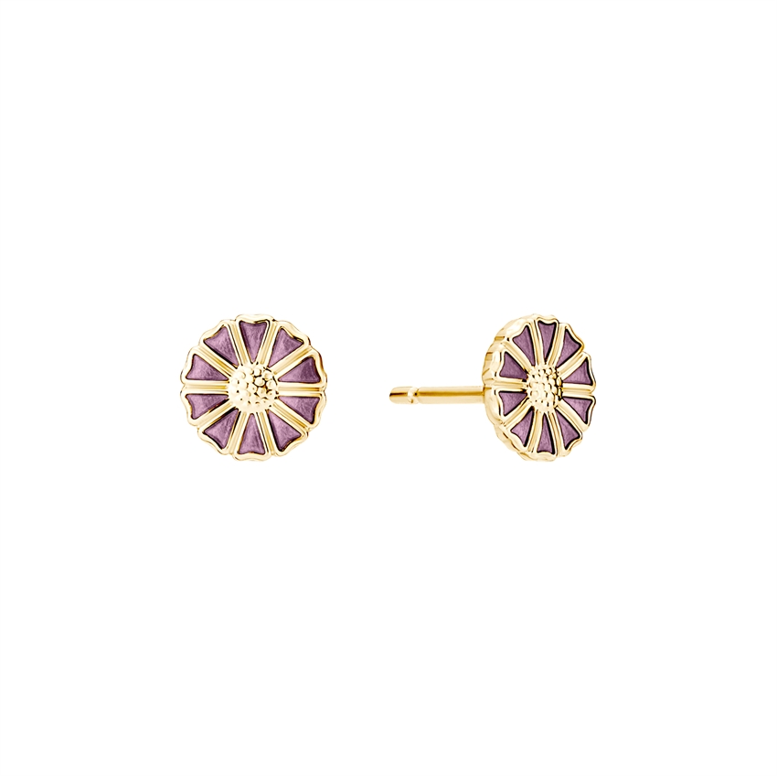Die Ohrringe sind aus Sterlingsilber gefertigt und mit 24 Karat Gold überzogen, was ihnen einen warmen goldenen Glanz und eine strapazierfähige Oberfläche verleiht. Die lila Emaille steht in schönem Kontrast zur Vergoldung und hebt die feinen Details der Marguerit auf elegante Weise hervor.