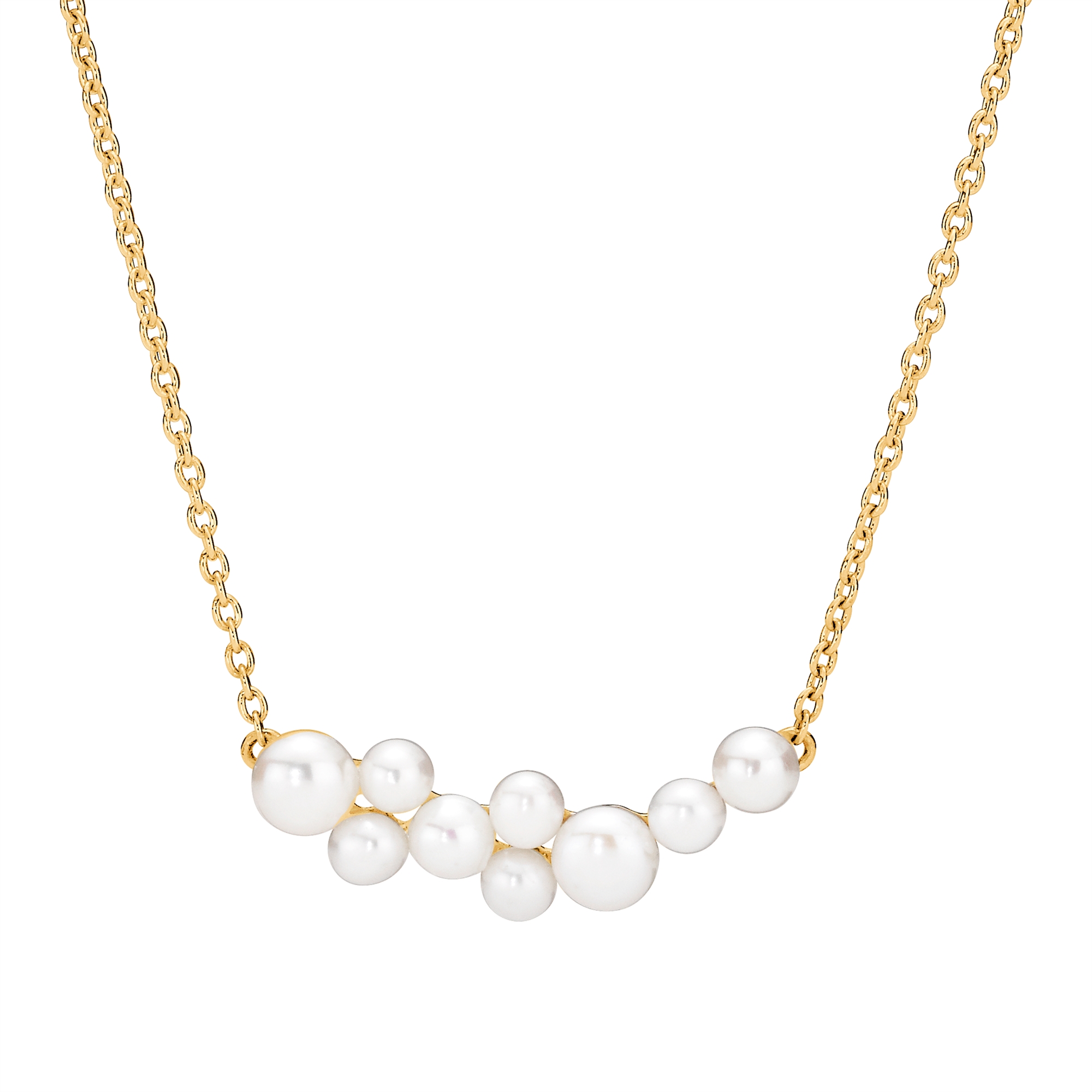Das Collier ist aus 8 Karat Gold überzogen, was ihm ein warmes und exklusives Finish verleiht. Die Süßwasserperlen messen 3–3,5 mm, 4–4,5 mm und 5–5,5 mm und sind elegant in der Mitte der Kette platziert, sodass sie einen natürlichen Fokuspunkt bilden.