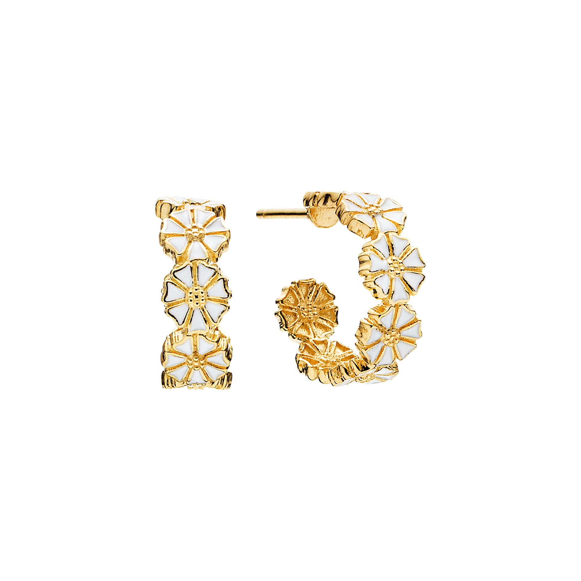 Diese Marguerit-Creolen sind ein schönes Beispiel für klassisches dänisches Schmuckdesign mit einem femininen und zeitlosen Ausdruck. Die Ohrringe sind mit den ikonischen Margueritenblumen verziert, die elegant der Form der Creole folgen und einen harmonischen und lebendigen Look schaffen. Die weiße Emaille verleiht den Blumen einen leichten und reinen Ausdruck, der im Kontrast zur warmen goldenen Oberfläche steht.