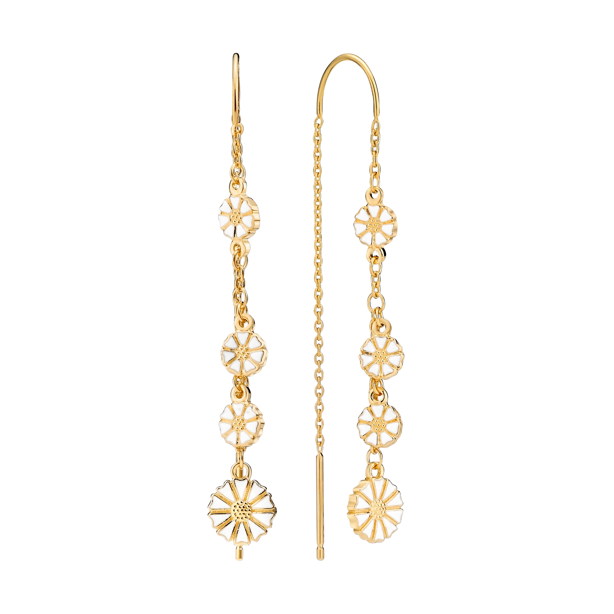 Die Ohrringe sind aus 925 Sterlingsilber gefertigt und mit 24 Karat Gold überzogen, was ihnen einen warmen goldenen Glanz und eine haltbare Oberfläche verleiht. Die Margeriten sind mit weißem Emaille verziert, das die Form der Blume betont und einen schönen Kontrast zur Goldbeschichtung schafft. Die kleineren Margeriten messen 3 x 5 mm, während die größere Margerite 1 x 7,5 mm misst, was ein elegantes und ausgewogenes Design ergibt.