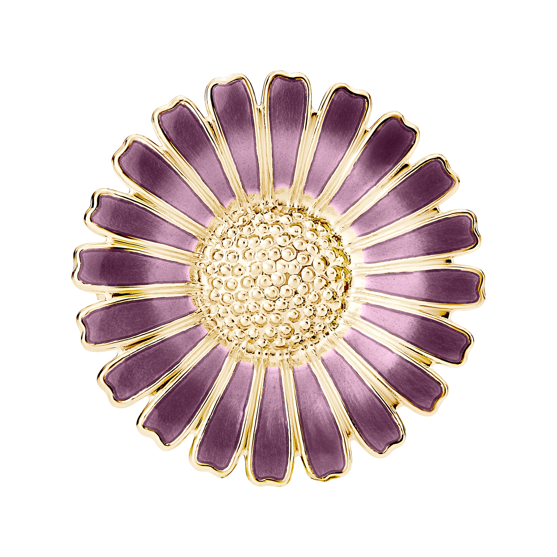 Die Brosche misst 36 mm und ist aus 925 Sterlingsilber gefertigt, mit 24 Karat Gold für ein warmes und exklusives Finish überzogen. Die lila emaillierten Blütenblätter verleihen dem klassischen Margueritmotiv einen raffinierten und modernen Twist und schaffen einen schönen Kontrast zur goldenen Mitte und Kante.