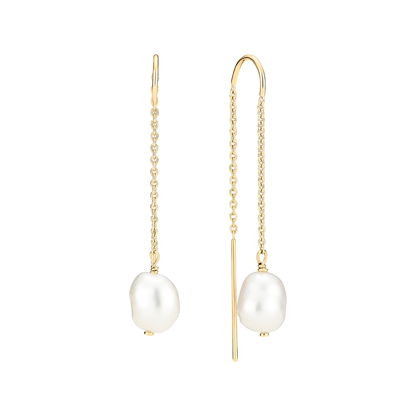 Die Ohrringe sind aus 925er Sterlingsilber gefertigt und mit 14 Karat Gold beschichtet, was ihnen ein warmes, goldenes Finish und eine langlebige Oberfläche verleiht. Die weißen Süßwasserperlen haben jede ihre eigene einzigartige Form, was jedes Paar Ohrringe besonders macht und die natürliche Eleganz des Schmucks unterstreicht.