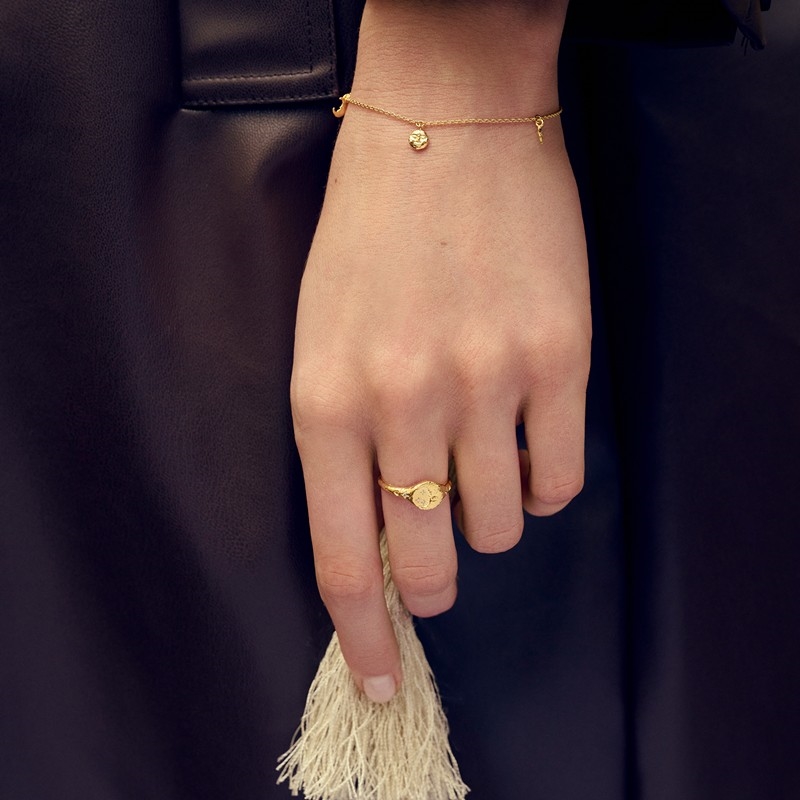Addison armband in vergoldete silber von Maanesten. Das Armband zeigt die Symbole Sonne, Mond und Tropfen, die Sie an die Ausgeglichenheit des Lebens und die doppelte Stärke erinnern, die in der Beziehung zwischen Tag und Nacht liegt.