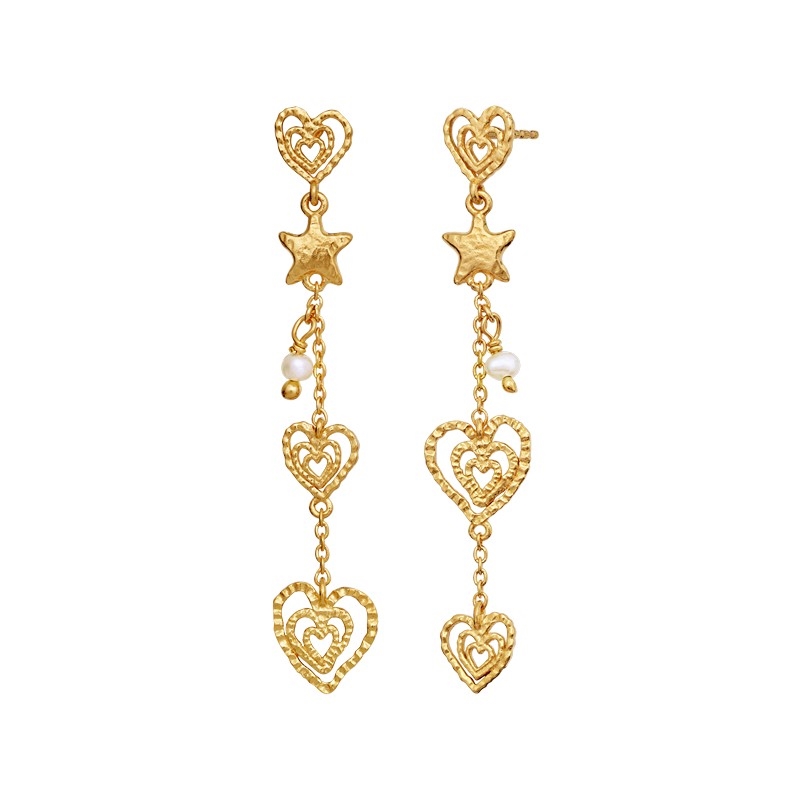 Frieden, Liebe und Harmonie treffen in den Irena Ohrringen aufeinander: Die wiederkehrenden Herzformen symbolisieren Nähe und Verbundenheit, während der Stern als Zeichen für Hoffnung und innere Ruhe steht. Eine kleine Süßwasserperle fügt ein klassisches und natürliches Element hinzu, das das verspielte Design mit einem Hauch Eleganz ausbalanciert.