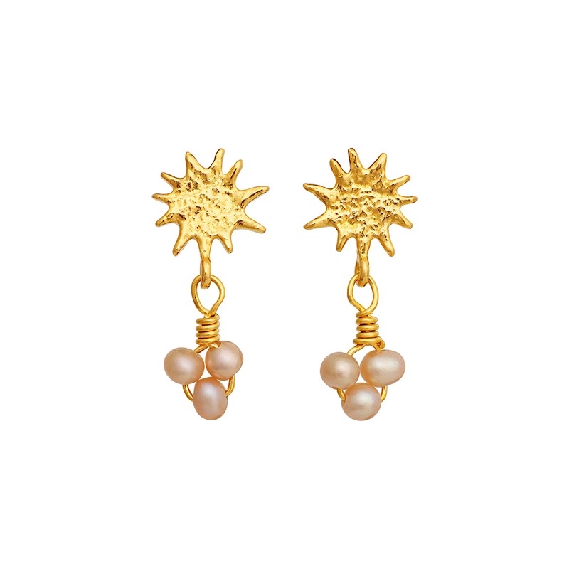 Am Ohr sitzt eine kleine Sonne, von der ein Büschel rosafarbener Perlen herabhängt. Das sorgt für eine leichte Bewegung und verleiht den Ohrringen einen lebendigen Look, ohne zu auffällig zu wirken. Die Farbe der Perlen harmoniert schön mit dem goldenen Material und bringt ein warmes, ruhiges Farbspiel ins Design.