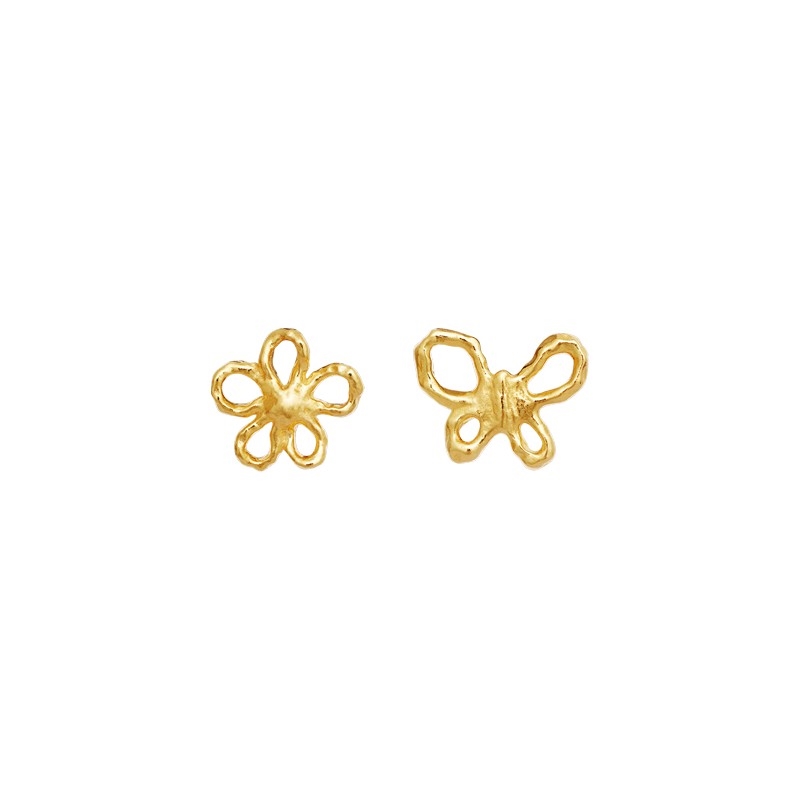 Die Paula Ohrringe von Maanesten sind kleine, feine Ohrstecker aus recyceltem Sterlingsilber (925), beschichtet mit 18 Karat Gold. Das schlichte Design besteht aus einer kleinen Blume und einem zarten Schmetterling, die zusammen einen leichten und poetischen Ausdruck schaffen. Die warme Vergoldung betont die organischen Formen und verleiht den Ohrringen einen weichen, goldenen Schimmer. Da die Ohrringe asymmetrisch sind, erhältst du einen schönen und persönlichen Look, der sich mit den kleinen Ohrringen variieren lässt.