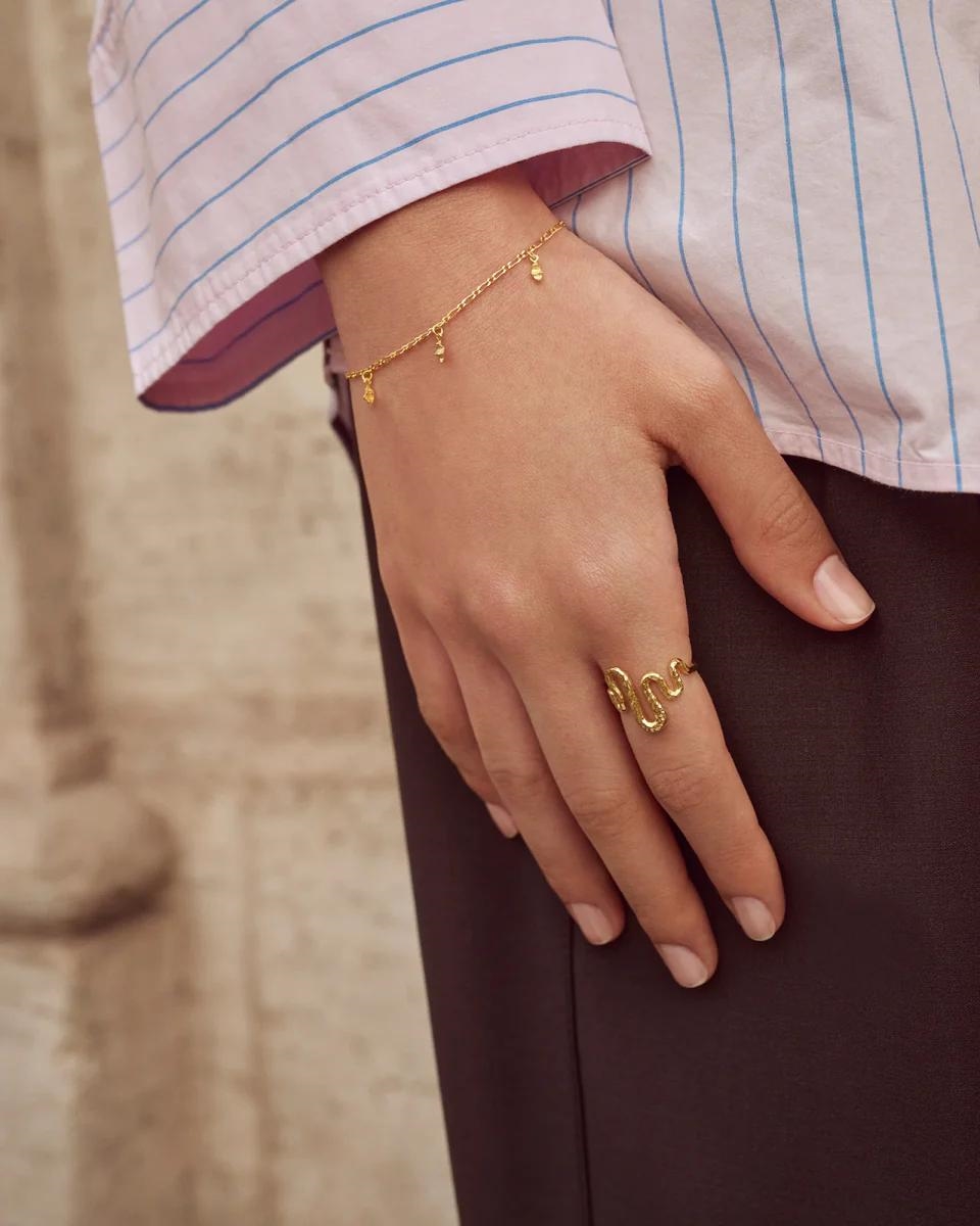 Una armband in vergoldete silber von Maanesten mit fein gehämmerten Anhängern. Die Anhänger sitzen an einer schlichten Figarokette, die dem Handgelenk ein zusätzliches Spiel verleiht.
