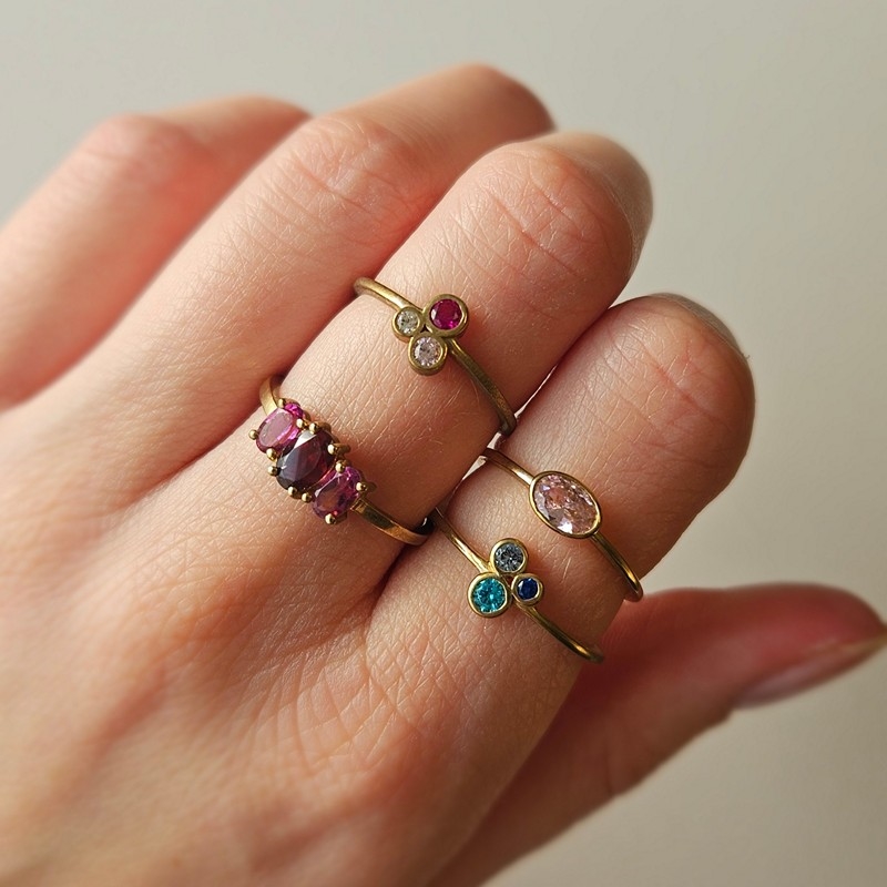 Die Emily Ring in 8 Karat Gold ist von Mads Z entworfen und hier mit 3 zirkonia in verschiedenen Nuancen zu sehen.