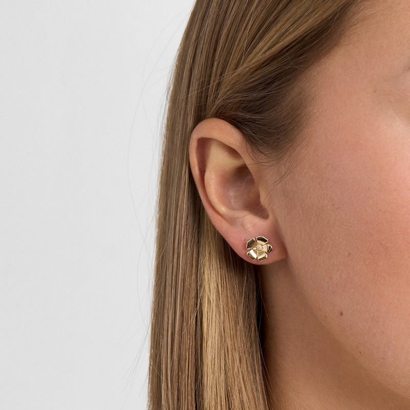 Die femininen Fleur Ohrringe in 14 kt Gold von Mads Z und der exklusiven Gold Label Kollektion mit 2 Diamanten. Die romantischen und gleichzeitig klassischen Blumenohrringe sind mit einer funkelnden Oberfläche von insgesamt 0,01 ct. W.SI Brillanten besetzt.