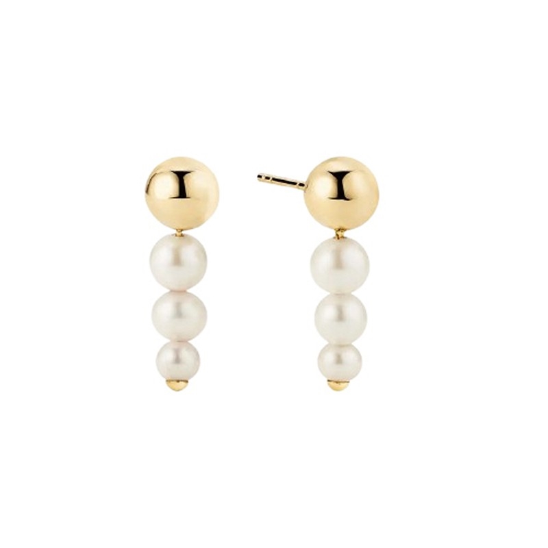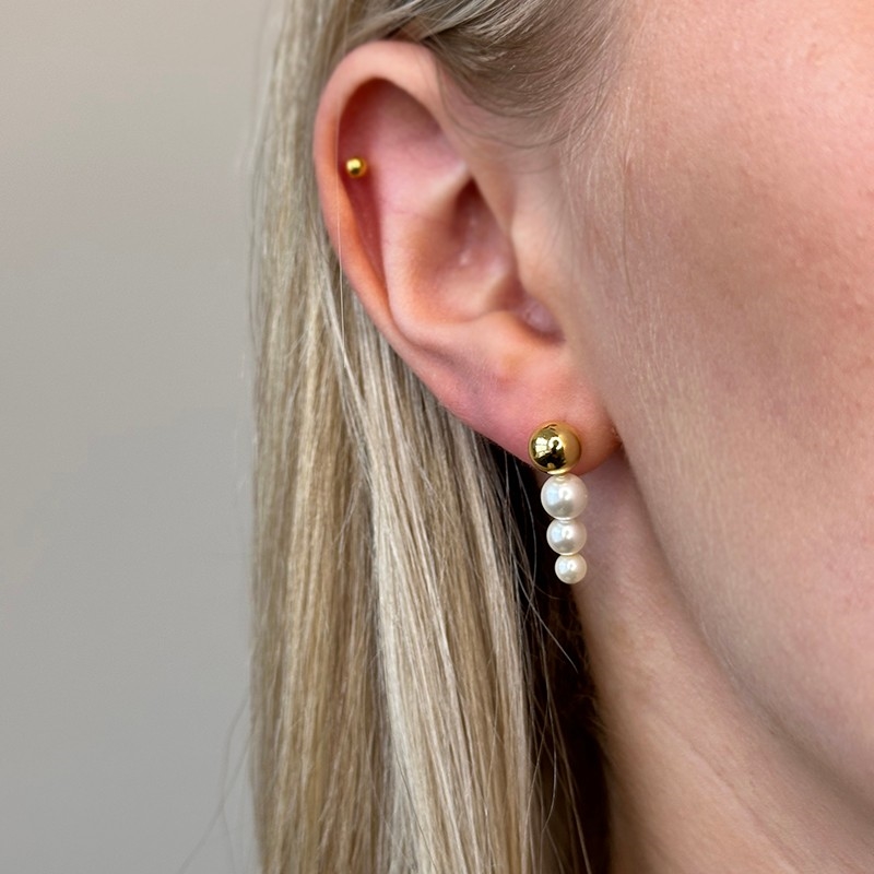 Carly Perlenohrringe in vergoldetem Silber von MerlePerle mit 3 Perlen in unterschiedlicher Größe an jedem Ohrring. Oben an den Ohrringen sitzt eine glänzende Perle in vergoldetem Silber.