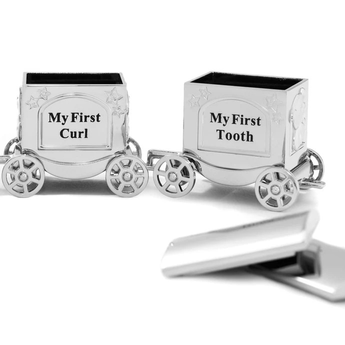 Diese schöne verchromte Dose in Form eines kleinen Zuges von NOA Kids ist eine charmante Möglichkeit, den ersten Zahn und die erste Haarlocke des Kindes aufzubewahren. Der Zug besteht aus drei Waggons, wobei die beiden hinteren kleine Dosen mit den Gravuren “My First Curl” und “My First Tooth” sind, damit die Erinnerungen ihren ganz eigenen Platz bekommen.
