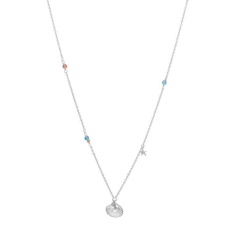 Die Halskette ist mit kleinen farbigen Details entlang der Kette verziert, die an Sonne, Sand und die sanften Nuancen des Meeres erinnern. Der feine Anhänger hat eine Form und Struktur, die an eine Muschel erinnert, und das kleine Perlendetail verleiht einen femininen Touch mit Bezug zu den Schätzen des Meeres. Die klare Silberoberfläche fängt das Licht schön ein und unterstreicht den leichten und eleganten Ausdruck des Schmucks.