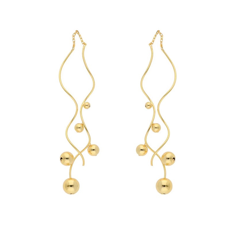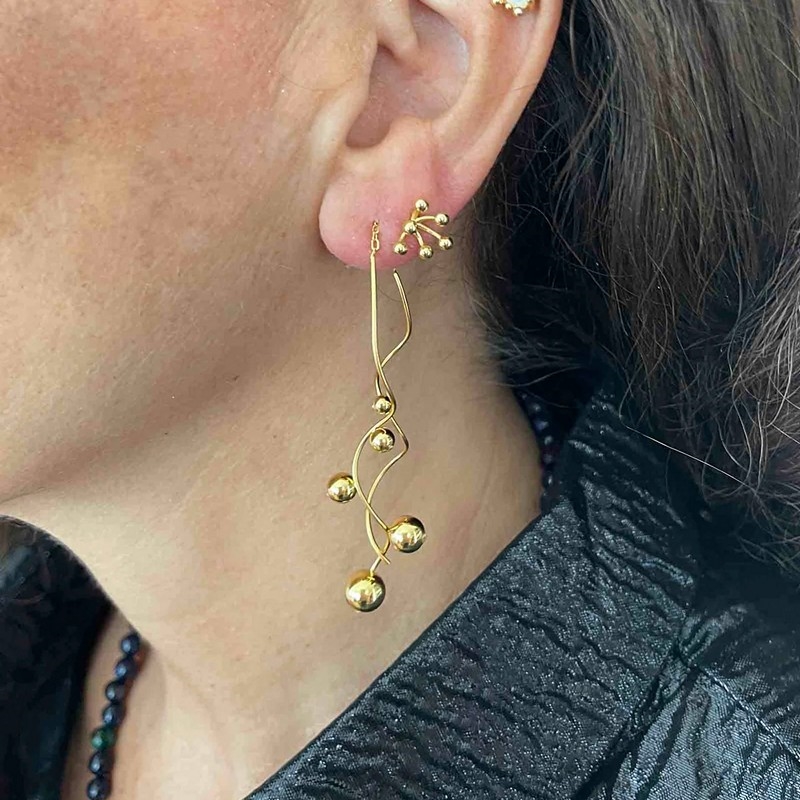 Entlang des goldenen Bogens sind kleine vergoldete Perlen mit Leichtigkeit und Präzision platziert. Die kleinen Kugeln verleihen den Ohrringen Struktur und Tiefe und schaffen ein elegantes Zusammenspiel zwischen der glänzenden Metalloberfläche und den runden Formen. Die vergoldeten Silberperlen folgen der Bewegung des Ohrrings und betonen das skulpturale Design, was für einen exklusiven und modernen Look sorgt.