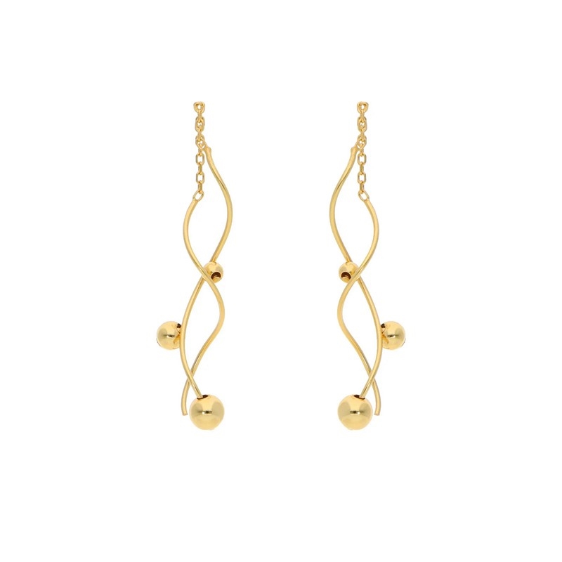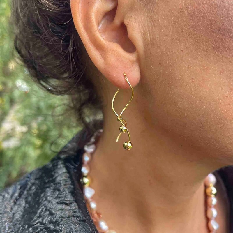 Entlang der goldenen Form sitzen kleine Vergoldet Silberkugeln, die der wellenfoermigen Linie des Ohrrings folgen. In dieser kleineren Version sind es etwas weniger Kugeln als beim grossen Modell, was fuer einen leichteren und schlichteren Look sorgt. Die kleinen Kugeln bringen Struktur hinein und erzeugen ein schoenes Lichtspiel, wenn die Ohrringe getragen werden.