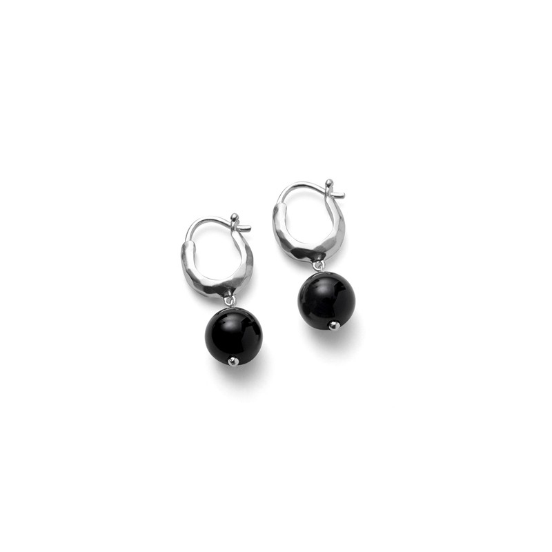 Der Hoop-Teil ist aus Sterlingsilber mit einer leicht gehämmerten Oberfläche gefertigt, die dem Schmuckstück einen organischen und natürlichen Touch verleiht. Das glänzende Silber steht in schönem Kontrast zu den tiefschwarzen Onyxperlen, und zusammen schaffen sie ein harmonisches Gleichgewicht zwischen Hell und Dunkel. Das Ergebnis ist ein Paar Ohrringe, das sowohl zeitlos als auch modern ist.