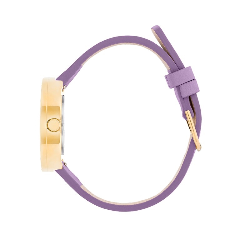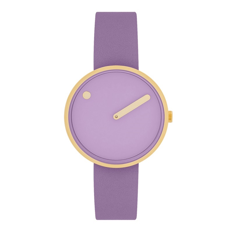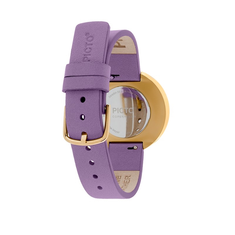Picto Uhr mit lavendelfarbenem Lederarmband, light lavender Zifferblatt und poliertem Uhrengehäuse in Gold – Durchmesser 34 mm.