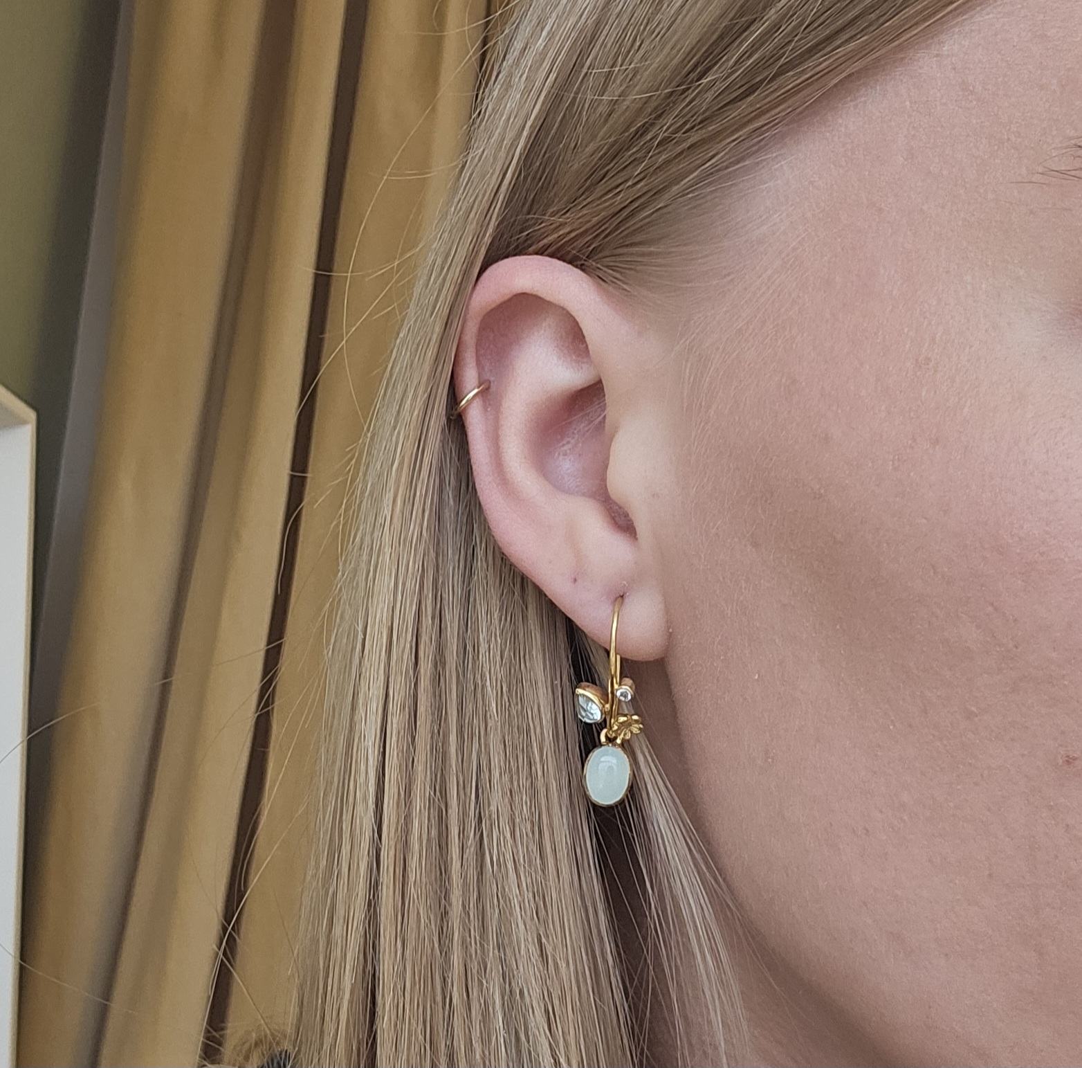 Schöne vergoldete Ohrringe aus der Rabinovich Forest Lake Kollektion. Der Ohrring besteht aus einem 8x6 mm großen Chalcedon, einem 3x5 mm großen Hydro-Aquamarin, einem 2 mm großen weißen Topas und einer kleinen Silberblume.