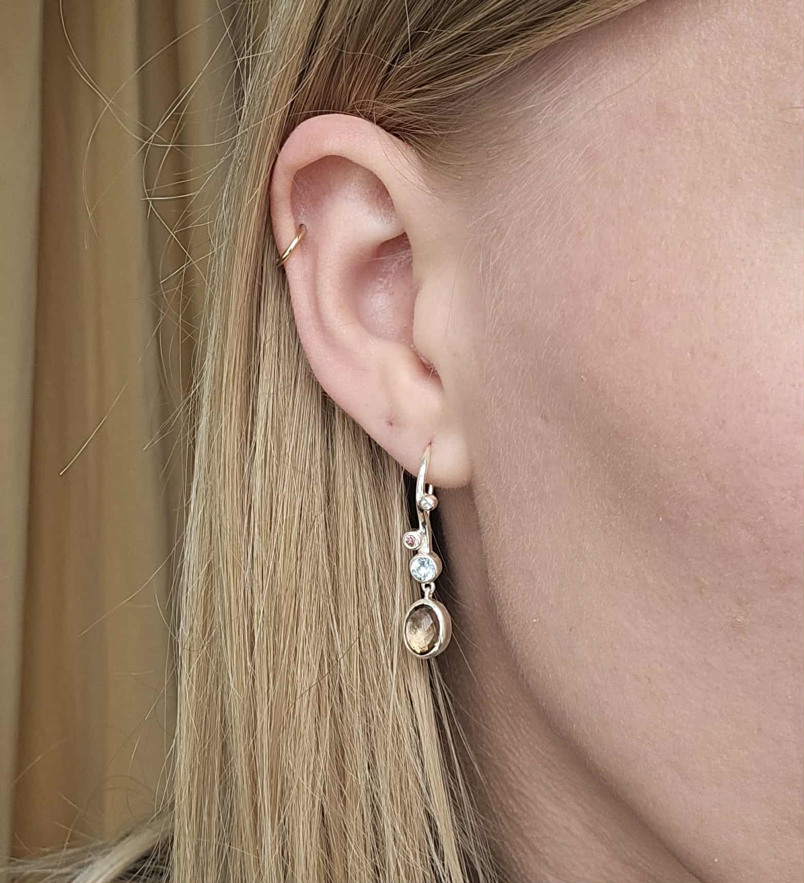 Glam Ohrringe in silber mit Steinen wie braunem Rauchquarz, himmelblauem Topas, rosa Turmalin und weißem Topas. Die Ohrringe sind von Danish Rabinovich und werden mit einer passenden Halskette geliefert.