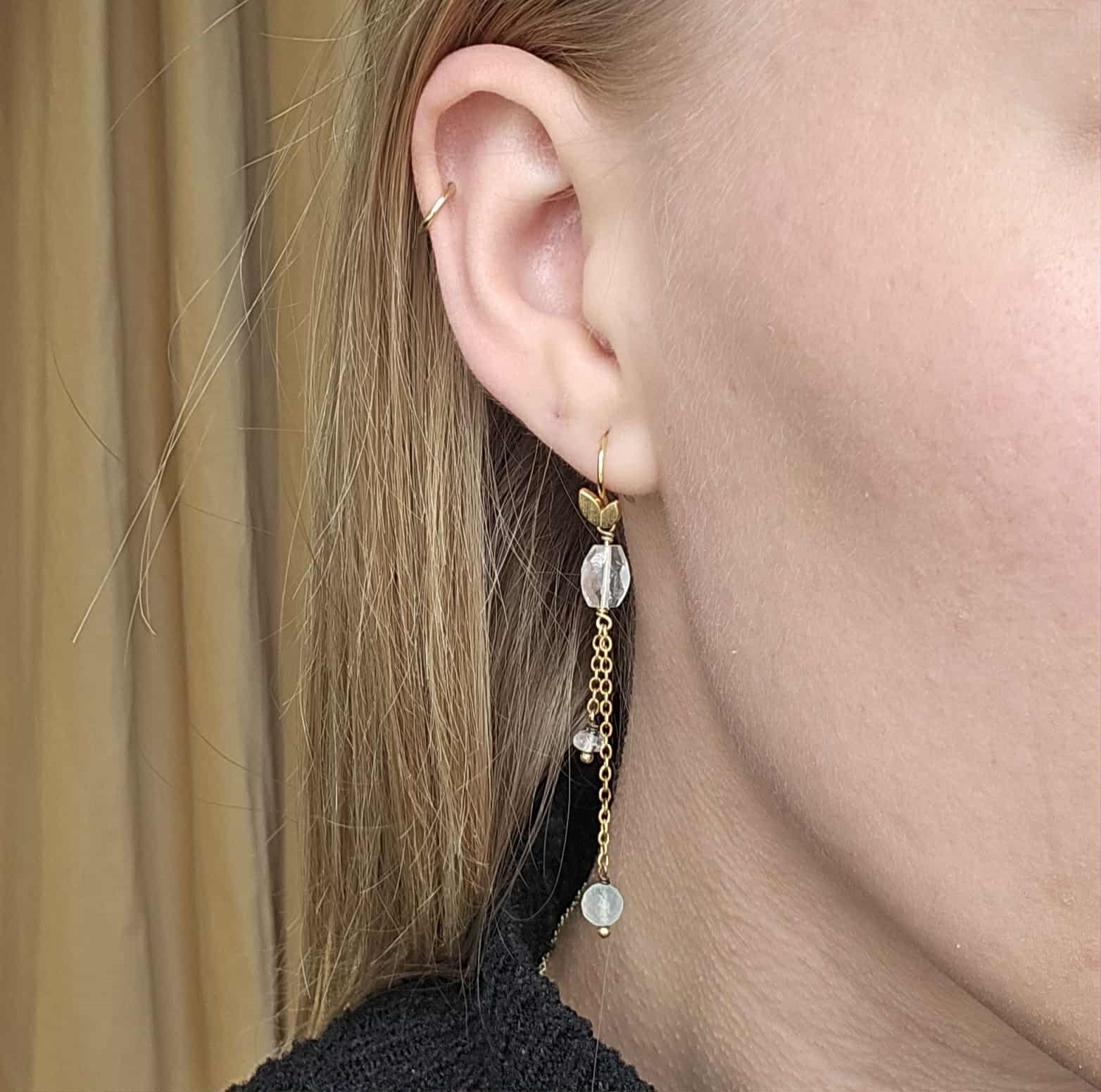Ohrringe mit einer Steinkette mit Aquamarin, Apatit und Chalcedon in schönem Design. Der Ausdruck ist einfach und skandinavisch, aber dennoch verträumt und exklusiv.