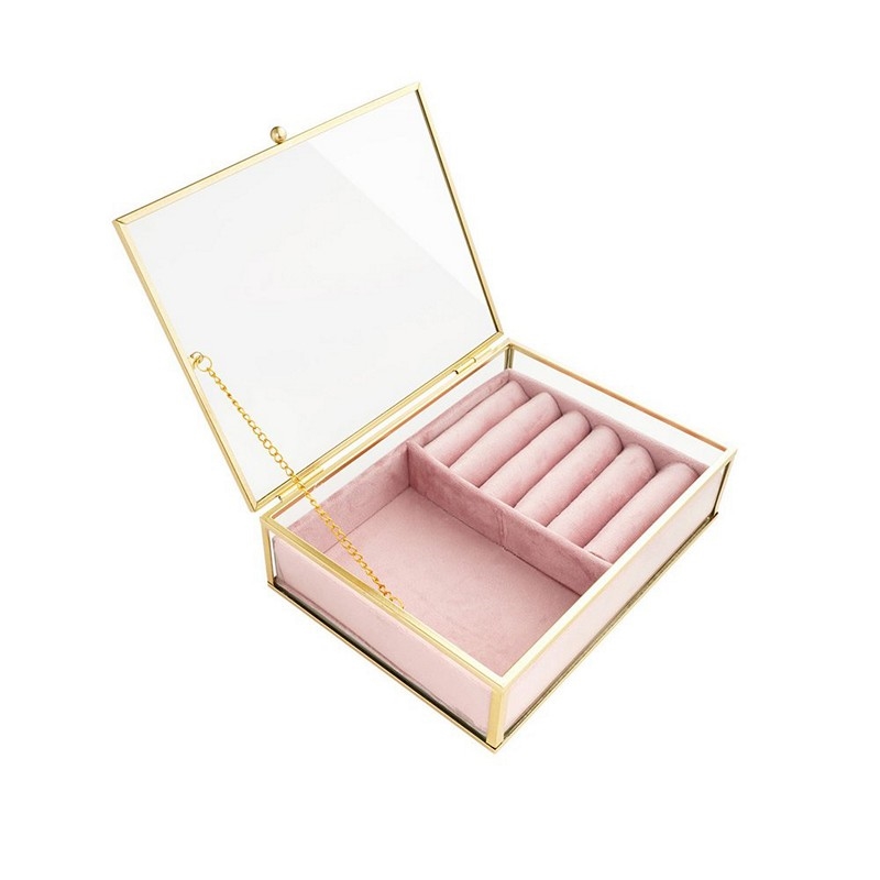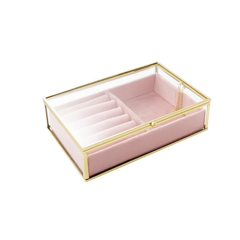 Innen ist das Schmuckkästchen mit weichem rosa Velours ausgekleidet, das Ihre Schmuckstücke vor Kratzern und Abnutzung schützt. Die gute Größe macht es leicht, Ihre Favoriten zu organisieren, egal ob Ringe, Armbänder, Halsketten oder Ohrringe. Der Glasdeckel bietet einen schönen Überblick über Ihren Schmuck, sodass Sie schnell das perfekte Schmuckstück für jeden Anlass finden.