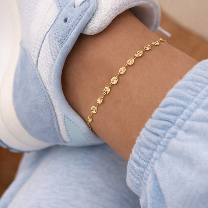 Das Fußkettchen sitzt leicht um den Knöchel und ist perfekt für Sommerkleider, Sandalen und nackte Füße, funktioniert aber auch gut als einfaches Detail für den Alltag. Die warme Vergoldung verleiht einen klassischen und zeitlosen Ausdruck, der sich leicht mit anderen goldfarbenen Schmuckstücken kombinieren lässt.